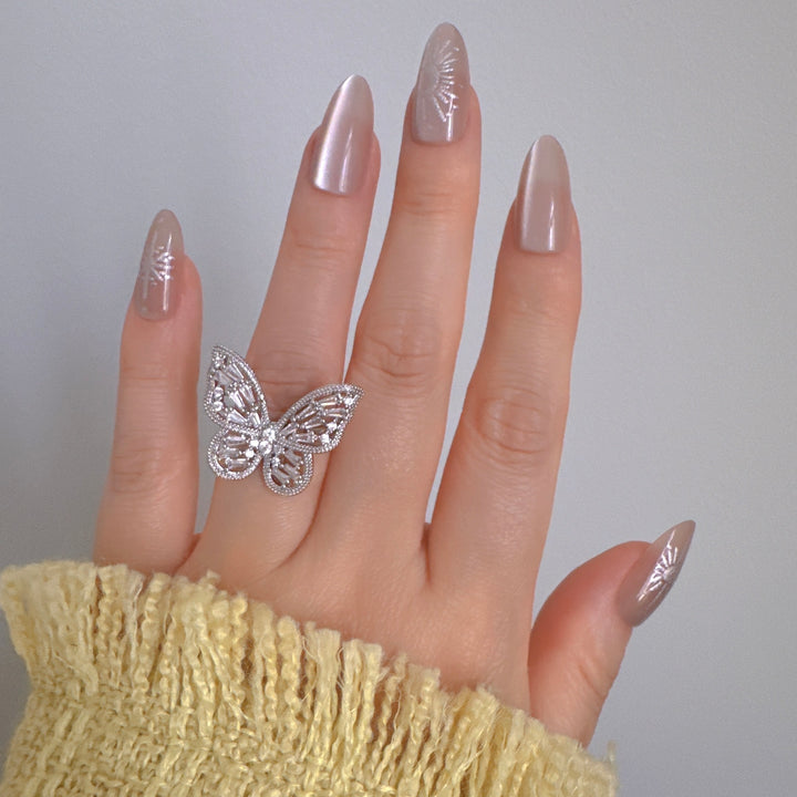 Astral Amour features a soft nude base with delicate celestial white starbursts, offering a dreamy yet minimalist vibe that pairs effortlessly with any look. Designed for modern romantics and stargazers alike, these nails add a subtle sparkle without saying too much.