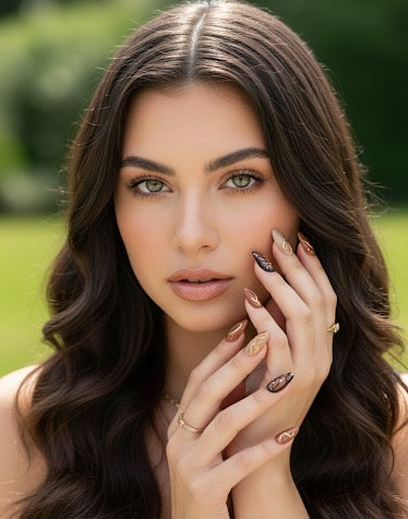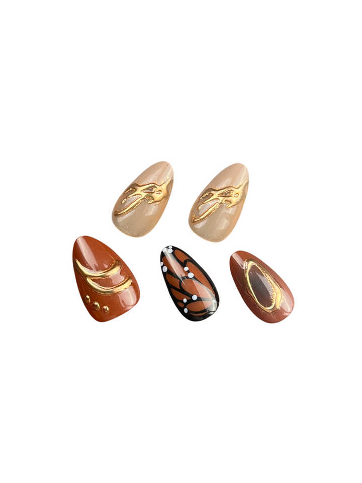 Elevate your nail game with these stunning press-on nails featuring unique designs in rich gold and warm brown tones. Perfect for any occasion, these nails combine elegance and style, making it easy to switch up your look in minutes. Whether you're going for a chic night out or a casual day, these designs will have you covered!