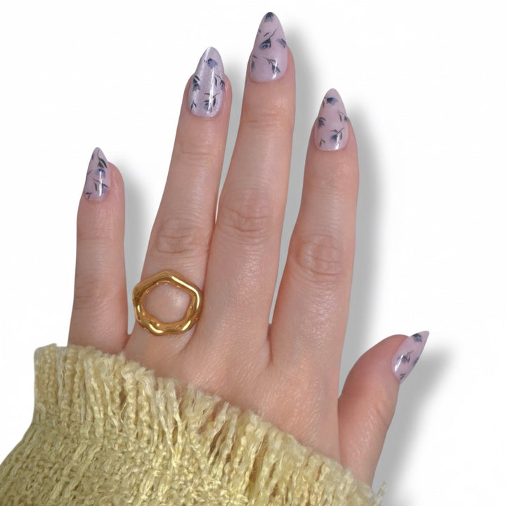 Violet Whisper features a soft blush base patterned with delicate violet florals and slender green stems. The floral design adds a graceful, botanical charm, making this almond-shaped set perfect for effortless everyday elegance or special occasions.