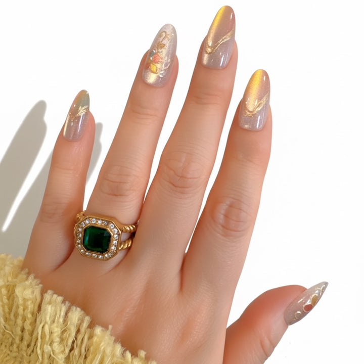 Fresh like a sorbet sunset, Peachy Bloom mixes soft peach tones with golden chrome swirls and delicate floral decals. Each nail glows with a pearlescent sheen, bringing the perfect blend of dreamy and daring. It’s the ultimate set for brunch dates, festivals, or whenever you’re feeling flirty and golden.