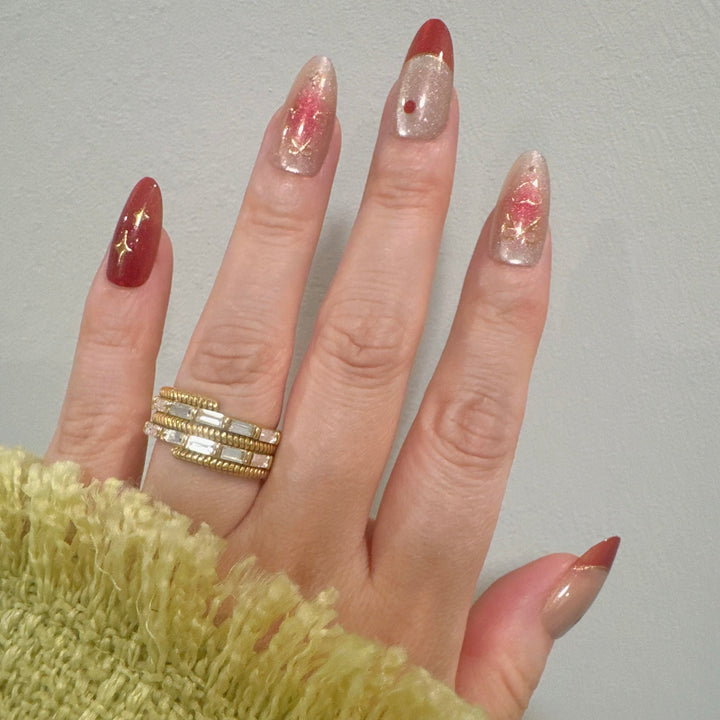 Fall for the stars with Stellar Crush — a romantic press-on nail set blending rich berry tones, soft sheer bases, and delicate gold foil accents. Featuring abstract hearts, celestial sparkles, and bold half-moon tips, this set is the perfect mix of playful and chic. Whether you're dressing up for date night or adding flair to your everyday look, Stellar Crush brings cosmic charm right to your fingertips. Comes with 30 nails in inclusive sizes for a salon-worthy fit.