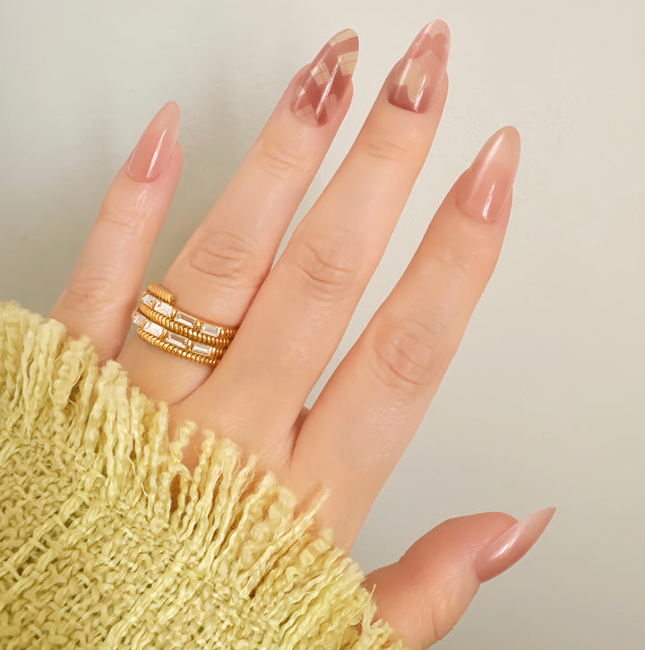 A playful twist on classic elegance — Wisteria Wonder features a warm mauve base in a glossy almond shape, accented with whimsical gingham hearts and checkered art. This set blends cozy charm with chic minimalism, perfect for expressing your sweet, creative side in seconds. Just press on and go — no salon needed.